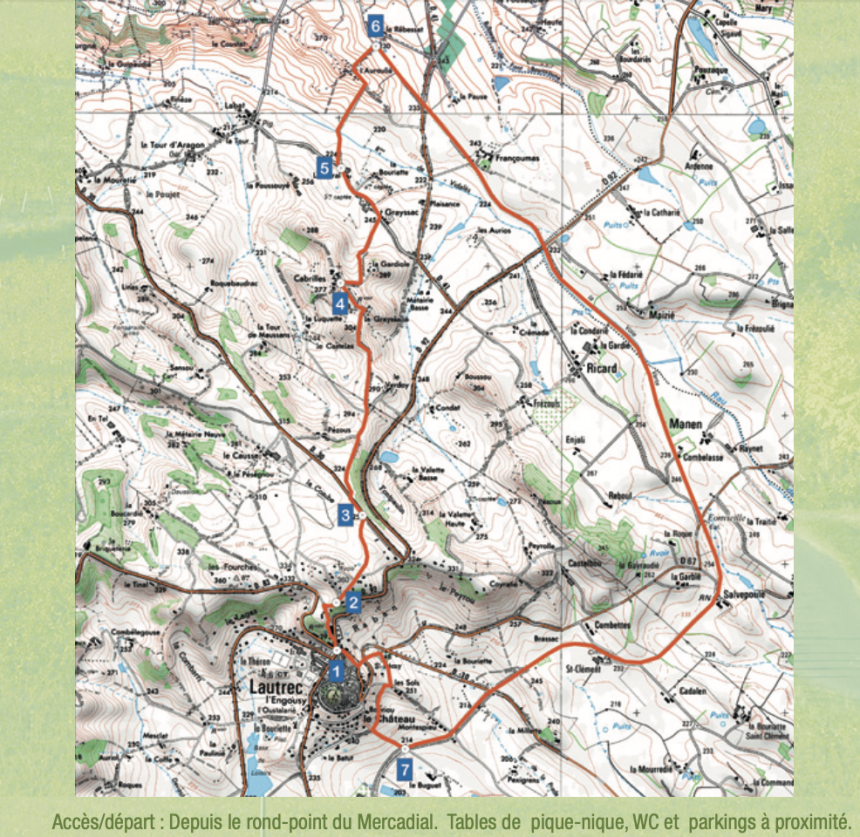 Ce circuit vous emmènera au cœur de la campagne lautrécoise à la rencontre de ce « petit » patrimoine souvent méconnu du grand public. Petite église à clocher-mur, ancien lavoir, silos, pigeonniers, etc. seront au rendez-vous ; vous découvrirez aussi tout au long de votre promenade de magnifiques paysages formés par la grande mosaïque de cultures agricoles. Vous passerez également sur une partie de la « voie verte » ou « chemin des droits de l’homme ». La section reliant Albi et Castres de cette ancienne ligne de chemin de fer entre Castelnaudary et Rodez fut aménagée en 2007 en chemin naturel, ouvert à tous les usagers non motorisés.